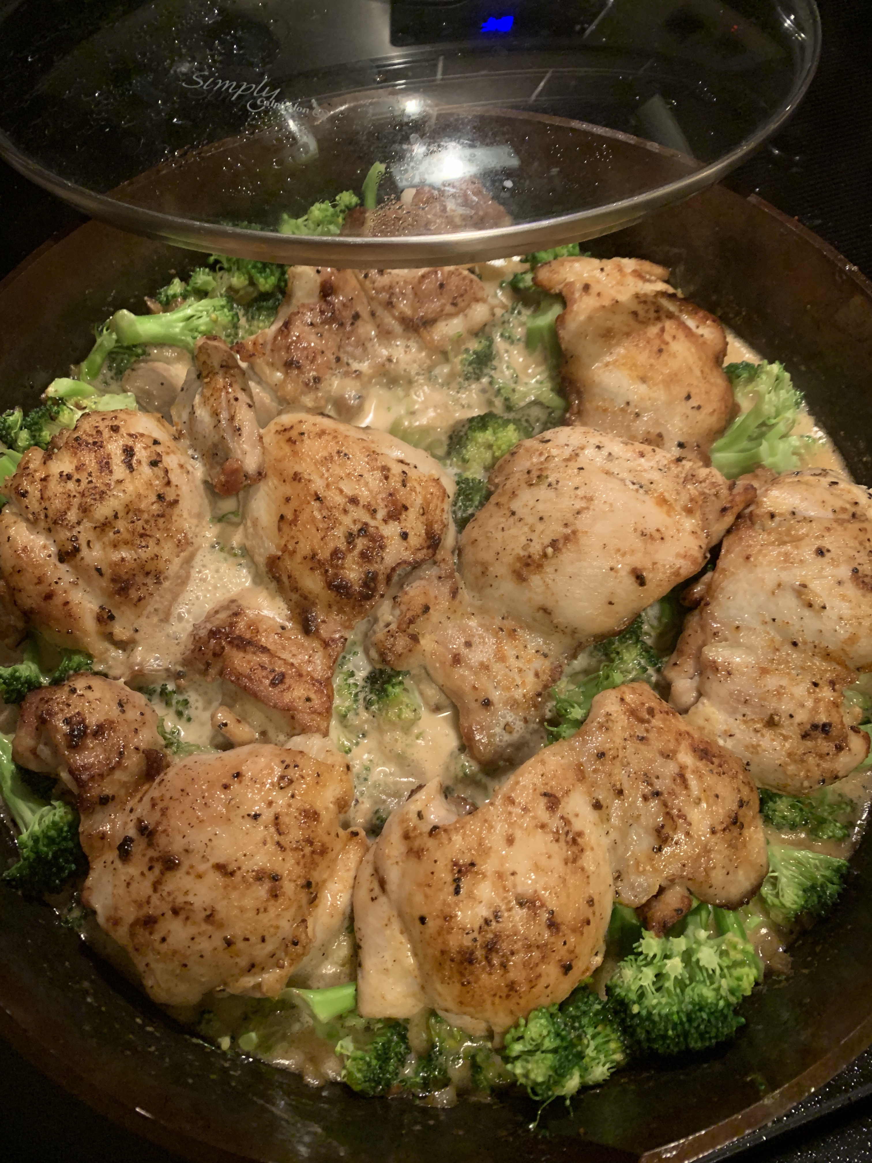 5) Once the cream mixture is bubbling, turn down to low. Add the broccoli to the pan and lay the chicken on top of the broccoli.