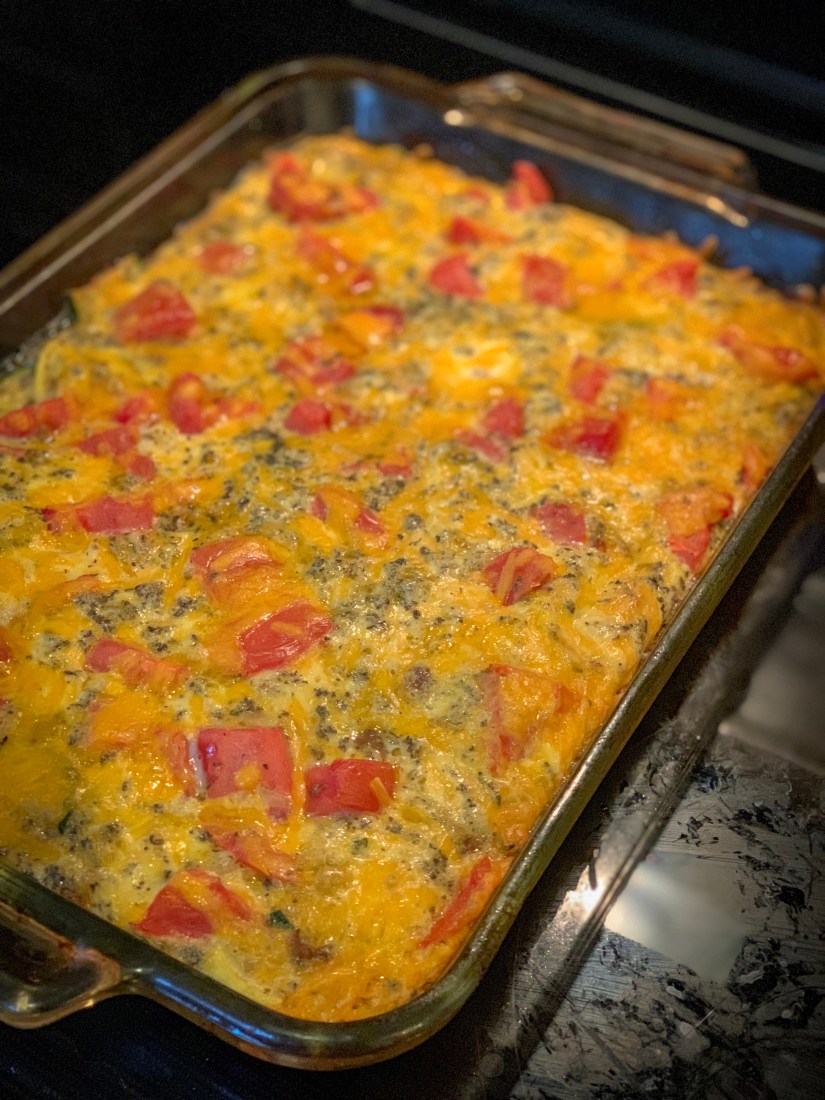 4) Pour sausage & veggie mixture into prepared dish and spread evenly. Layer chopped tomato on top.